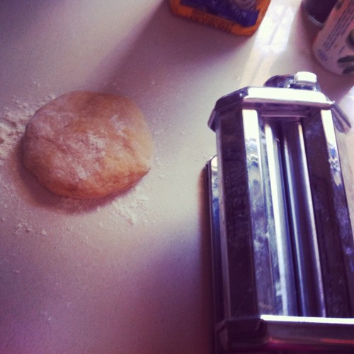 מרדדים במכונת פסטה 5-6 פעמים על מספר אחד כאשר מקפלים את הבצק בכל פעם ואחר כך מרדדים פעמיים על כל מספר מבין המספרים 2-4 כאשר בין לבין מקמחים היטב עם מעט קמח.