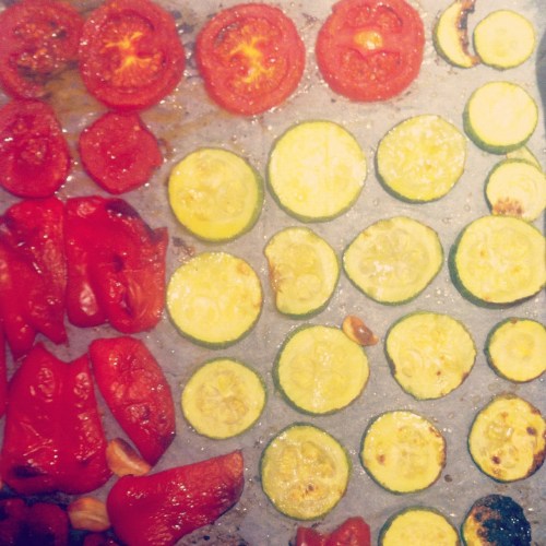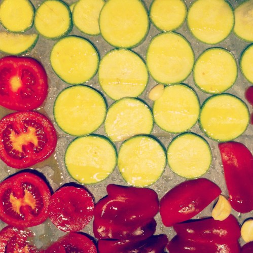 מחממים תנור ל-200 מעלות. חותכים את הקישואים לטבעות דקות. חותכים את העגבניה לטבעות. חותכים את הפלפלים לפיסות בינוניות. חוצים את שני השום לאורכם. מסדרים יפה את הירקות בשכבה אחת בתבנית שעליה נייר אפייה משומן בשמן זית. מפזרים מלח גס ואופים 20 דקות. אם לאחר 20 דקות הירקות לא חרוכים מעט, להעלות את הטמפרטורה ל-230 ולאפות עוד 2-3 דקות.