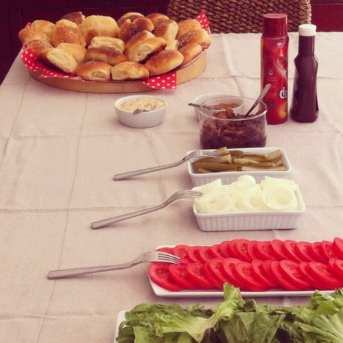 מסדרים בנפרד את התוספות על צלחת הגשה יפה וכל אחד מרכיב לעצמו את ההמבורגר.