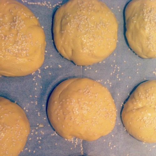 יש ללוש עשר דקות ויהיה נחמד עם תתחלקו עם מישהו. בסוף הבצק יפרד מהקערה אבל עדין יהיה יחסית דביק. מכסים במגבת ונותנים לו לתפוח 45 דקות או עד הכפלת הנפח. מניחים ניירות אפיה בשתי תבניות. קורצים כדורים בגודל הרצוי לפי גודל ההמבורגר המתוכנן..לי יצאו 15 לחמניות לכמות כזאת (הכנתי כמות כפולה- אך בשתי קערות נפרדות, כי כמות אחת תופסת קערה שלמה). מכדררים בידים ומניחים את הכדורים בתבניות- לא משטחים את הכדורים..הם ישתטחו לבד. יש להשאיר מרווח בין הלחמניות כי הן תופחות. מניחים מגבת על כל תבנית ומשאירים לתפוח. לאחר עשרים דקות מחממים תנור ל-180 מעלות ומשאירים לתפוח עוד עד שהתנור חם. בקערה קטנה מקשקשים ביצה, מוסיפים חצי כף מים ומערבבים. בעזרת מברשת מברישים את הלחמניות ומפזרים שומשום.