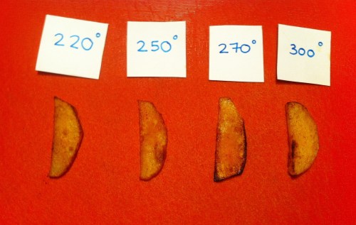 אני ניסיתי דרגות חום שונות ומבחן טעימה עיוור (אורן טעם) גילה שתפוחי האדמה שנאפו בחום הגבוה יותר (270 מעלות ו-300 מעלות) היו הכי טעימים..החום הגבוה גורם לקריספיות ומתקרב מאד לצ'יפס מטוגן. אך, החלטתי לא להמליץ לכם על ה-300 מעלות כי ממש צריך לשים לב שלא ישרף ואם לא כל תפוחי האדמה אחידים בגודלם חלק יכולים להשרף וחלק יהיו לא מספיק עשויים.