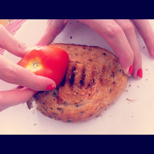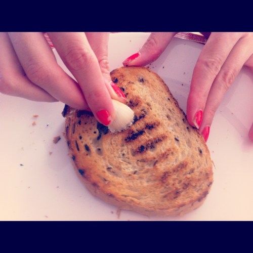 משפשפים את העגבניה מהצד החתוך על הלחם תוך לחיצה קלה כדי שיצא מיץ.