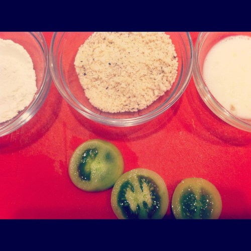 פורסים את העגבניות לפרוסות בעובי 1 ס"מ. טובלים בקמח> בביצה> פירורי לחם.