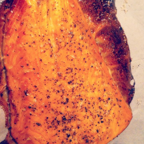 מחממים תנור ל-200 מעלות. מניחים בתבנית נייר אפייה מניחים עליה את הסלמון עם העור כלפי מטה. מפזרים כף דבש כך שיצפה את כל הסלמון. מפזרים פלפל שחור ומלח גס. מכניסים לתנור ל-15 דקות.