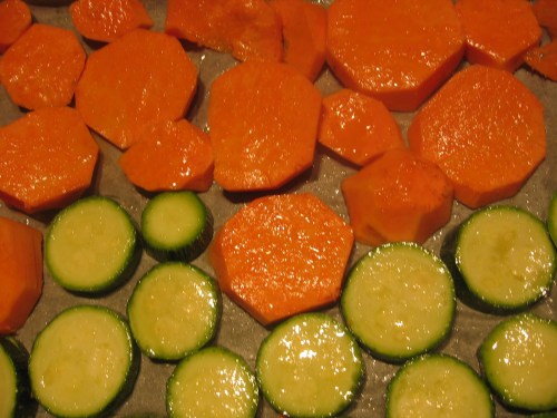 מסדרים בשכבה אחת בתבנית עם נייר אפיה ומזליפים שמן זית- את הקישואים מומלץ להבריש בשמן זית כדי שישחימו ואז יהיה להם טעם מעט מתקתק. ממליחים ומכניסים לתנור ל- 20 דקות.