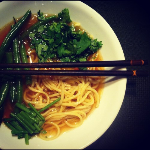 מניחים את הטבליה של ציר העוף בכוס עם מים רותחים ומערבבים עד שיימס. קוטמים את הקצה של השעועית בצד אחד (זה שנראה קשה). קוצצים את השום והג'ינג'ר. מניחים בסיר או בווק מעט שמן רגיל (לא שמן זית) מוסיפים את השום והג'ינג'ר ומזהיבים. מוסיפים כף רוטב דגים. מוסיפים את כוס המים הרותחים עם הציר. מוסיפים עוד כוס וחצי מים רותחים לסיר. מוסיפים כף סויה ועיגולים מחצי פלפלון ומערבבים. מוסיפים את השעועית הירוקה. מבשלים 3 דקות.