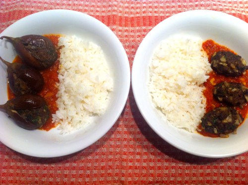 הצד שלה- מנה של מוסקה עם חצילונים קטנטנים מושלמים. הצד שלו- לא אוהב חציל במוסקה- אז יקבל קבבים בתנור. מכינים רוטב עגבניות עם טריק על הגז.