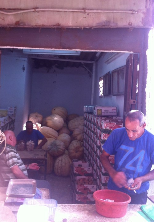 דוכן מעניין שראיתי היה של מוכר דלעות כאשר על השולחן מוכנות חתיכות של דלעת אך מה שהרשים הוא מלאי הדלעות הענקיות המונחות מאחוריו.