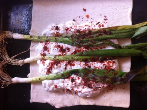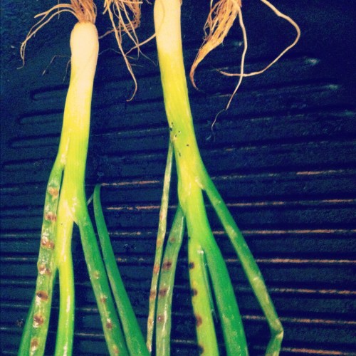 מניחים על גז עם להבה גבוהה מחבת פסים. כשהמחבת חם מוסיפים בצל ירוק שמשחנו במעט שמן זית- מקפלים את הבצל כך שכולו יכנס למחבת. צורבים בערך שתי דקות מכל צד. מוציאים לקרש חיתוך וחותכים בגודל 3-4 ס"מ.