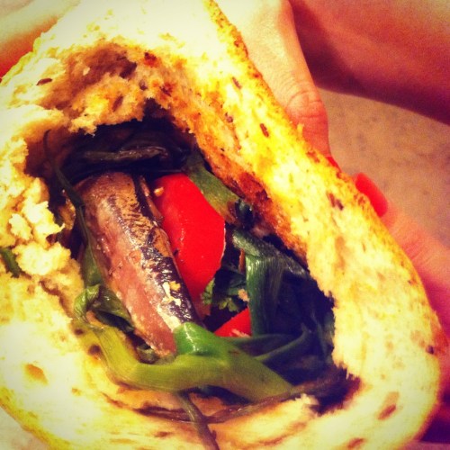 בגיל 7 הייתי באתונה עם אבא שלי. אני אפילו לא זוכרת אם מה שקיבלתי היה סרדינים או שווארמה אבל מה שלא אשכח הוא את כיכר הלחם השלמה שקיבלתי. פשוט כיכר לחם של פעם ללא התוך. זה היה בלתי נשכח. החלטתי להכין מנה כזאת משלי אך ריחמתי על עצמי והכנתי חצי כיכר והוספתי הרבה ירק בשביל האוורירית. מה אני אגיד לכם יצא ממש מוצלח.