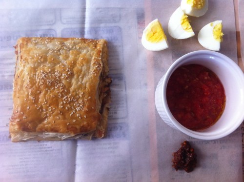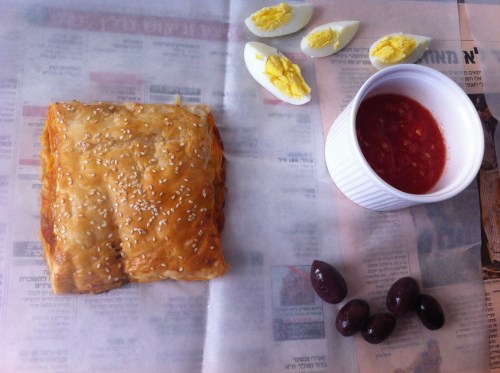 תוספות לאכילה ביחד עם הבורקס- זיתים, אריסה, רסק עגבניות, ביצים, שמנת חמוצה שמעליה שמן זית וקצת רסק עגבניות, טפנד זיתים.