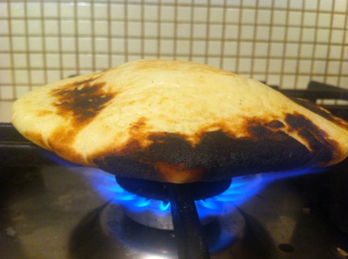 מניחים פיתה על להבת גז בינונית ושורפים מספר שניות. מכבים את הגז, הופכים ושורפים מהצד השני. חוזרים על הפעולה עם הפיתה השניה. חותכים את הפיתה עם סכין כך שיווצר פתח- יש לבצע בזהירות רבה כי הפיתה מלאה באדים. ממלאים את הפיתה בתערובת הבשר ומוסיפים ביצת עין. אוכלים מיד.