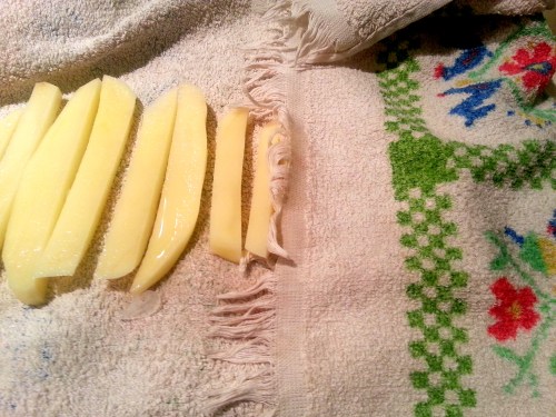 יש לקרר את הצ'יפסים לפני הטיגון על ידי הכנסה לקערה עם מים עם קרח. כשרוצים לטגן, מוציאים מהמים ומייבשים בעזרת מגבת.