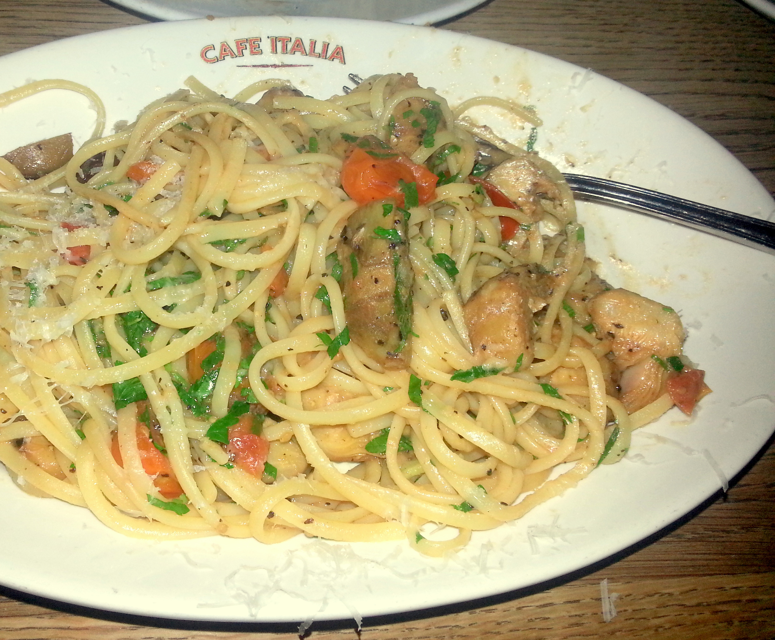אני הזמנתי הפעם פסטה ברוטב שמן זית, ארטישוקים צלויים, עגבניות שרי וזיתי קלמטה. מנה מתובלת וטעימה ואני בהחלט אוהבת שיש אופציות טעימות של פסטה במסעדות שלא על בסיס שמנת ובקפה איטליה יש כמה מנות על בסיס שמן זית. המלצר מגרד במקום פרמזן עד שאומרים "די" וזה נחמד ואיטלקי והפרמזן בעל טעם עז וטעים.
