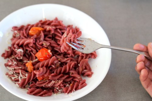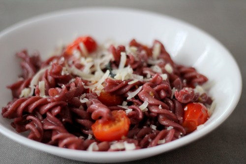 האיטלקים קוראים לפסטה pasta dell'ubriaco כלומר פסטה שיכורה אבל אני טוענת שהיא פשוט מאוהבת. מדובר במנת פסטה אלגנטית ומקסימה בעלת צבע משגע (היות והיא מתבשלת ביין אדום) שתוכלו להכין לארוחת ערב רומנטית או סתם לכיף. במקור מכינים עם רוטב עם חמאה שמן זית שום ופטרוזיליה  אבל אני שילבתי כאן עגבניות שרי ובזיליקום שמוסיפים טעמים (לפסטה עצמה יש טעם עדין מאד).