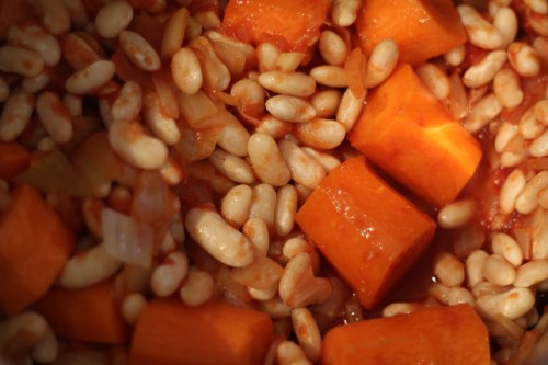 חותכים את הבצל לרבעים ואת השום לחצאים. מקלפים את תפוחי האדמה והגזר וחותכים לחתיכות גדולות. מגרדים שתי עגבניות בפומפיה. מחממים מעט שמן זית בסיר גדול מניחים את הבצל והגזר ומזהיבים תוך עירבוב מדי פעם. מוסיפים את השום ומטגנים כמה שניות. מוסיפים את השעועית, העגבניות המגורדות, הרסק והסוכר ומערבבים מוסיפים את הציר או מים עם אבקת מרק ומביאים לרתיחה.