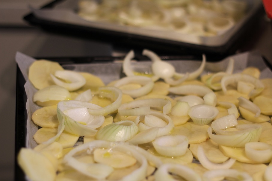 זה לקח לי 4 תבניות לכל הכמות הזו- כלומר שמתי בתנור שתי נגלות של שתי תבניות. זה חשוב להניח שכבה אחת של תפוחי האדמה ולא אחד על השני כדי שיתבשלו באופן אחיד, לכן תתכננו את הזמן שתספיקו להכין. אין בעיה להשאיר את תפוחי האדמה והבצל בקערה ולהכין את הטורטיה מאוחר יותר.