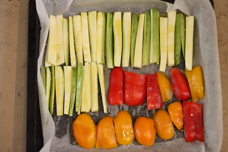 פלפלים– כדאי להשתמש בפלפלים מכל מיני צבעים. חותכים מכל צד של הפלפל. אם זה פלפל גדול חותכים כל פרוסה שוב. מזליפים מעט שמן זית, אפשר גם בלי שמן בכלל.