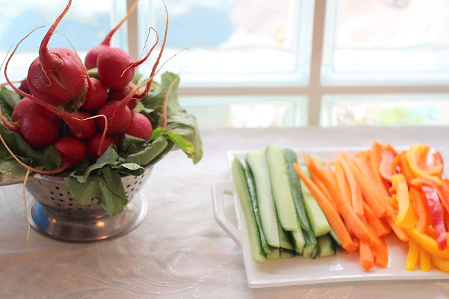 גזרים פלפלים ומלפפונים חתוכים לרצועות וגם כמה כדורי עגבניות שרי.