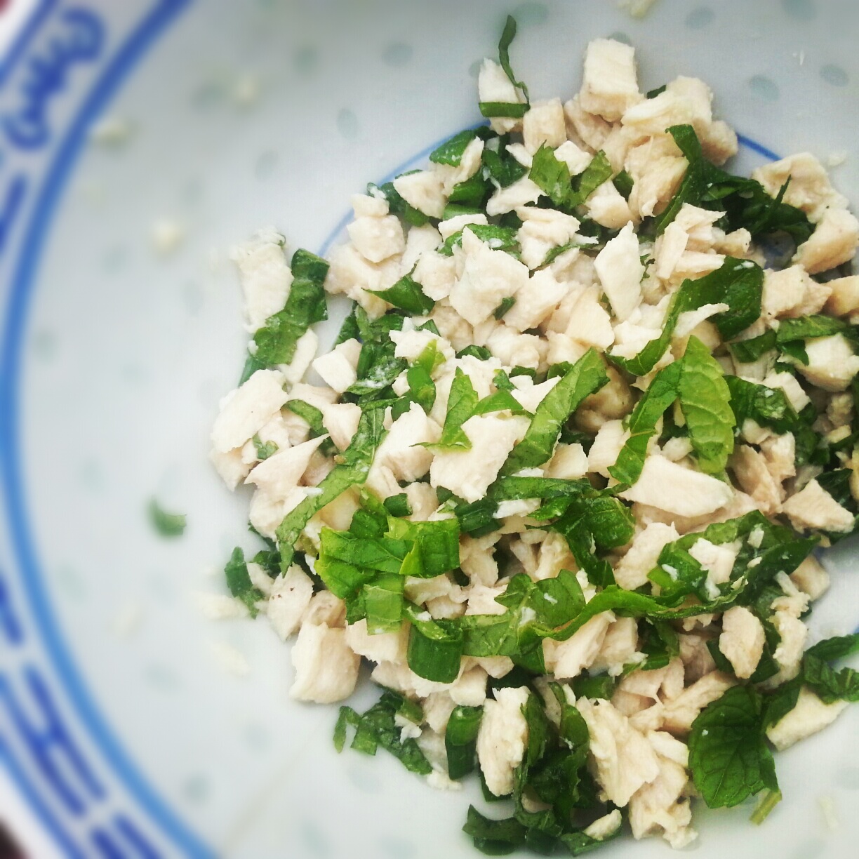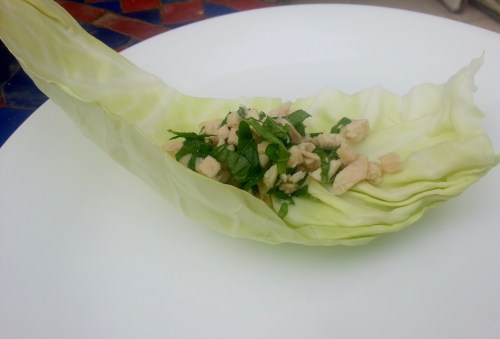 מניחים במחבת מים מהברז. מניחים על הגז וכשמתחילים לרתוח מוסיפים את חזה העוף. מבשלים כמה דקות במים עד שמוכן, אם לא בטוחים, חותכים חתיכה קטנה ובודקים שזה לבן מבפנים. מוציאים ומניחים להתקרר בצד. בינתיים, מפרידים עלי כרוב ובוחרים כמה יפים. קוצצים את הבצל הירוק לעיגולים קטנים. קוצצים דק את הנענע. קוצצים מעט פלפל חריף. חותכים את חזה העוף לחתיכות קטנטנות> חותכים לרצועות דקות ואז מהצד השני. מניחים בקערה את הבצל הירוק, הנענע, הפלפל החריף והעוף. מוסיפים רוטב דגים (כף או יותר לפי הטעם- להיזהר ולא להוסיף מהתחלה כמות גדולה כי יש לו טעם עז) ומיץ לימון- מתחילים עם כף מיץ לימון מערבבים, טועמים ואם צריך מוסיפים עוד.