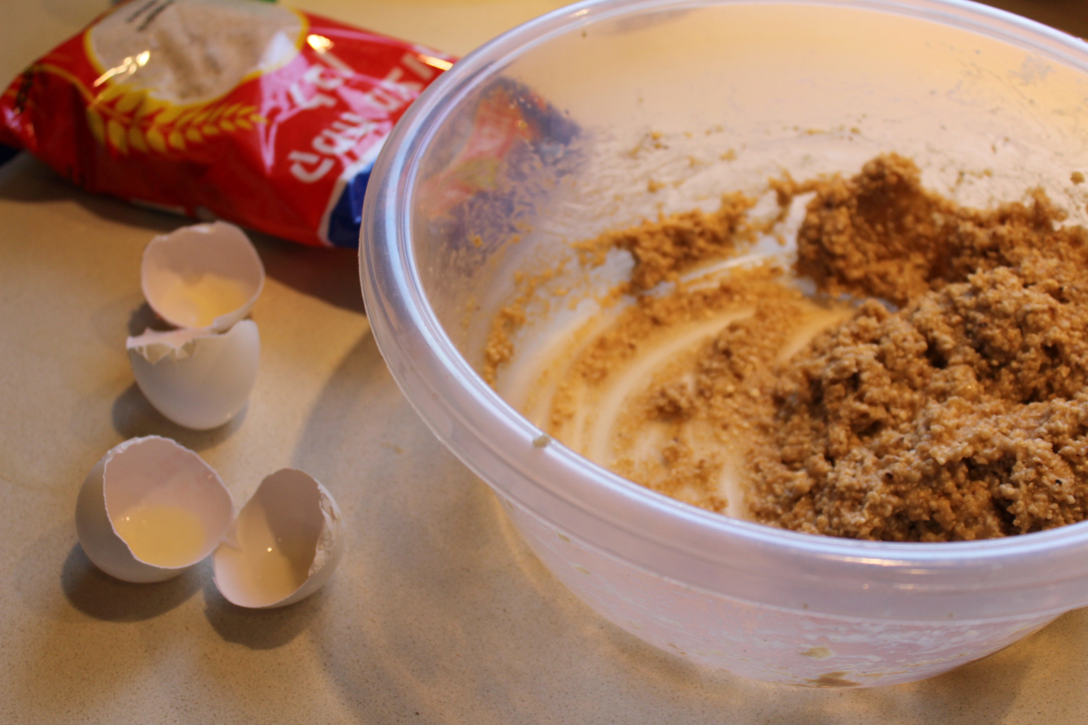 מכינים- מניחים בקערה כוס קמח מצה. מוסיפים מים רותחים ומערבבים היטב. מוסיפים ביצה ומערבבים היטב. מוסיפים את הביצה השנייה ומערבבים היטב. מוסיפים מלח פלפל ומערבבים היטב.