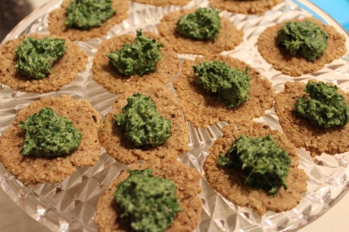 מניחים קרקרים על צלחת הגשה ובעזרת כפית מניחים מהפסטו במרכז כל קרקר.