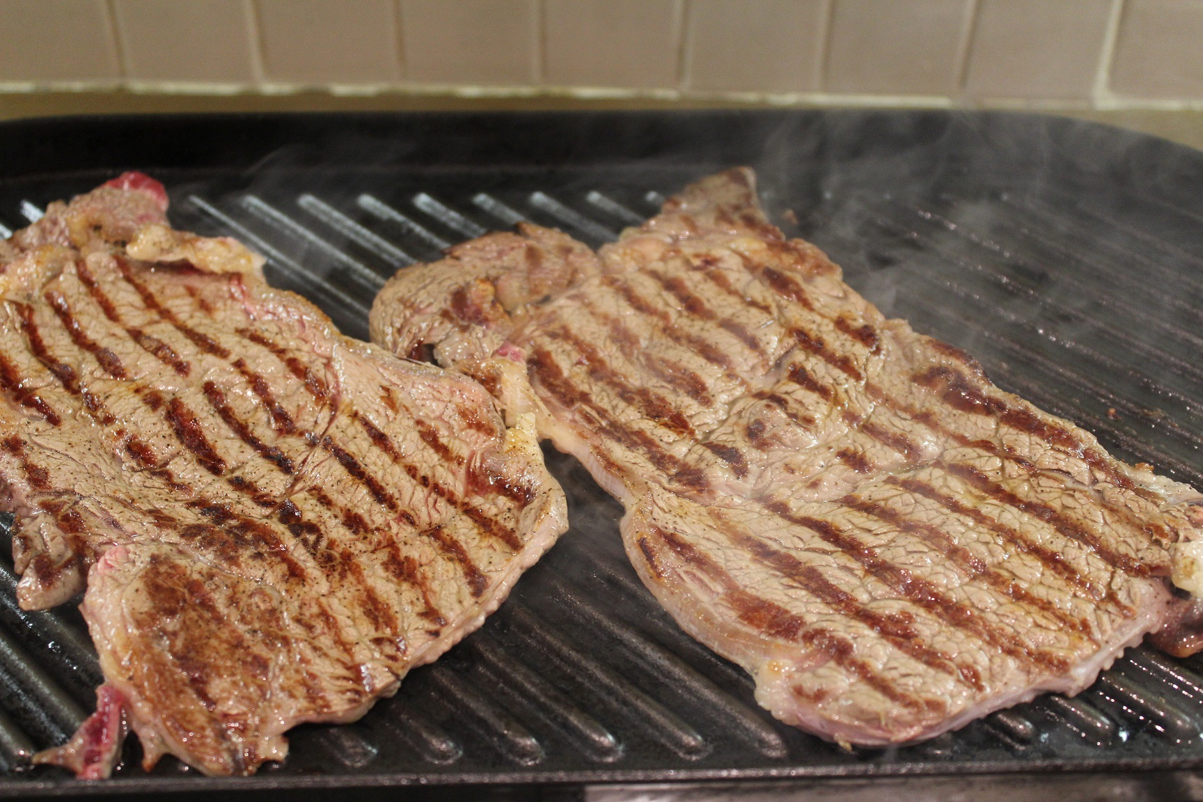 מפזרים קצת פלפל שחור ולא ממליחים עדין. מחממים מחבת פסים על להבה גבוהה וכשחם (מניחים את היד באוויר מעל המחבת ומרגישים אם חם) מניחים את הסטייקים ונותנים להם 20 שניות להיצרב – בלי להזיז אותם כדי שיקבלו פסי חריכה. הופכים וצורבים עוד 10-20 שניות. הסטייקים האלו באמת מוכנים תוך שניות אז להיזהר לא לטגן יותר מדי. מניחים לכל אחד סטייק בצלחת ומפזרים קצת מלח גס. מתענגים.