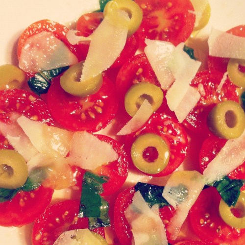 התכוונתי להכין סלט עגבניות שרי- בזיליקום- שמן זית-בלסמי שאנחנו אוכלים הרבה כחלק מארוחת ערב כשלפתע הבחנתי בזיתים במקרר, אז החלטתי לוותר על בלסמי ולהוסיף את הזיתים. זה הזכיר לי פיצה אז הוספתי פרמז'ן. יצא טעים מאד וקל להכנה, ממש שתי דקות, הנה-